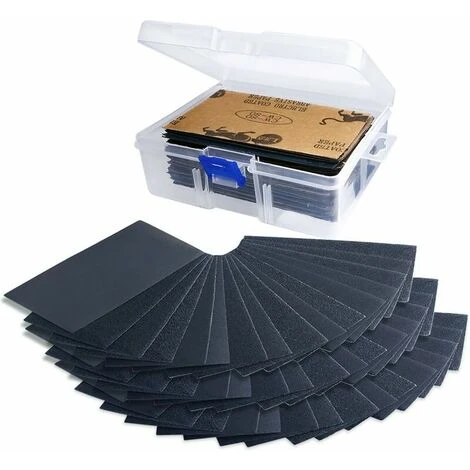 6 feuilles de chaque grain : 60/80/100/120/150/180/240/320/400/600/800/1000/1200/1500/2000/2500/3000 – Total : 102 feuilles.