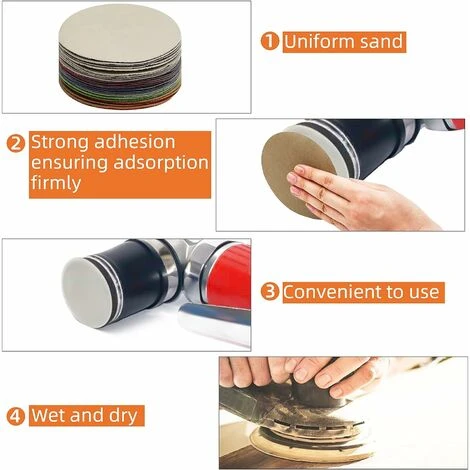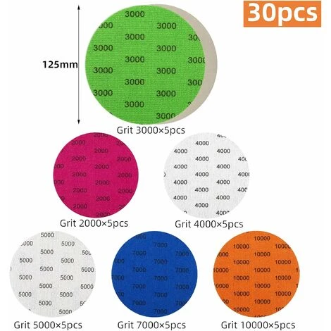 Divers papiers abrasifs: 30 pièces avec 2000/3000/4000/5000/7000/10000, de la granularité grossière à fine, pour répondre aux différentes exigences de polissage, plus la granularité est grande. L’effet de polissage est meilleur. Vous pouvez diriger la lampe de poche vers la surface du sable et le numéro de la surface du sable s’affichera sur la surface en daim.Bon adhésif : les attaches velcro, faciles à coller sur la ponceuse orbitale aléatoire, ne tomberont pas pendant l’utilisationDurabilité : le moulin à eau est fait de papier latex de haute qualité et de carbure de silicium, qui est durable, antistatique, flexible, résistant à l’usure et non colmatant. Avec des particules uniformes et peu de poussière, c’est un bon choix pour le meulage et le polissage.Patins de ponçage auto-agrippants : ces disques de ponçage ronds à eau humide et sèche peuvent également être utilisés pour le polissage à la main. Le coussin peut réduire les vibrations pendant l’utilisation. Il peut également prolonger la durée de vie du tampon de sable.Large gamme d’utilisations : les meules de 125 mm sont compatibles avec la plupart des outils rotatifs, tels que les ponceuses à moules, les meuleuses à air, les perceuses électriques, etc., et peuvent également être utilisées pour le polissage manuel. Habituellement utilisé pour le polissage, comme le métal, le bois, le plastique, l’aluminium, la pierre artificielle, les meubles en bois, le traitement des moules, le polissage des équipements de précision, le polissage des voitures