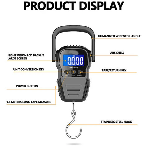 Color: BlackMaterial: ABS shellSize: 130 * 90 * 25mmWeight: 300gPackage includes: 1 * electronic scale 1 * waterproof bag 2 * AAA batteryWeighing range: 50g-50kgUnit: kilograms/pounds/amperesProduct features:Precise hand scale, comfortable and spacious handle, can accommodate 4 fingers, and the weight is not limited to the hand, making it easy to extract heavy objects.High precision sensor, weighing 20g, precise weighing.It can weigh up to 50kg, with a large range and strong force.Carefully designed waterproof bag, easy to carry, waterproof and dustproof.Equipped with a 1.6-meter tape measure, weighing and measuring with one scale.Three units can be switched freely to meet various needs.Protruding large buttons for comfortable and convenient operation.