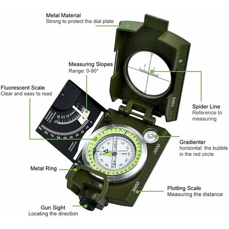Fonction boussole deux-en-un : positionnement, mesure de l’azimut, mesure de la longueur, de la largeur et de la hauteur de l’objet mesuré. Référez-vous au tableau pour estimer la distance. La ligne d’étalonnage verticale qui vous permet de lire directement les données et d’améliorer leur précision. Il peut être utilisé pour localiser, orienter, etc. sur la carte.Conception fluorescente : flèches directionnelles magnétiques et conception spéciale de la lampe fluorescente, vous permettant de lire les données dans un environnement sombre après avoir absorbé suffisamment de lumière du soleil. Ligne d’étalonnage verticale pour améliorer sa précision.♧ Imperméable et antichoc : boussole professionnelle étanche et antichoc, adaptée à toutes les activités d’urgence et de plein air, telles que la conduite, la navigation de plaisance, le camping, la randonnée, la chasse, l’aventure, le kayak, le snowboard, la randonnée et d’autres activités de plein air.Facile à manipuler et à transporter : il est portable et peut être facilement mis dans votre poche. Livré avec une corde en nylon imperméable. Très approprié pour les activités de plein air, les activités, les sports d’aventure, etc.♧ Multifonction : boussole de poche avec couvercle métallique rabattable, cadran flottant à l’échelle 360°, échelle CM et pied, table inclinée, prisme réglable, étanche et antichoc. Cette boussole de poche vous aidera à trouver un sens de l’orientation dans les profondeurs de la nature.Description du produitTaille: Boussole militaireboussole militaire professionnelle iitrust, boussole en métal étanche IP65 goniomètre à boussole de visée fluorescente, équipée d’un étui de transport, adaptée à l’aventure/au camping/à l’orientationFonction: Positionnement de base, mesure d’azimut, mesure de pente, angle de déviation, niveau de mesure, mesure de la longueur, de la largeur et de la hauteur de l’objet. Il est très approprié pour la chasse, la randonnée, la géologie et d’autres activités de plein air.Matériau : métal d’ingénierie à haute résistance, peinture verte militaire.Caractéristiques:Ce modèle utilise un vrai viseur, vous permettant de lire directement sur le cadran intérieur de la boussole. La ligne d’alignement de visée vous permet de profiter pleinement de tous les avantages de la résolution de 1° utilisée sur le cadran de la boussole. Les inclinomètres vous permettent de mesurer les dénivelés et les pentes. Couvercle métallique pliable. Flèches magnétiques fluorescentes. Une vue avec vue. Boussole légère et pratique : la taille pliable rend votre voyage plus pratique. Cadran flottant et rotatif avec échelle 360°. Valeur d’échelle claire, lecture oculaire haute définition. Travailler dans des conditions météorologiques extrêmes. Très approprié pour le camping, l’escalade, la navigation de plaisance, l’exploration, la randonnée,Chasse, géologie et autres activités de plein air.