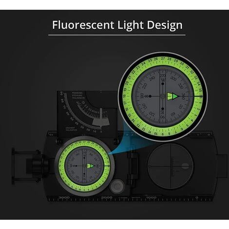 Design fluorescent : la flèche d’orientation magnétique et le cadran du compas sont fluorescents pour vous permettre de lire les données dans un environnement sombre après qu’ils aient absorbé suffisamment de lumière solaire.