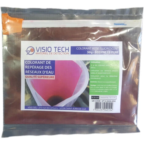 Le colorant rose fluorescent de la marque VISIO TECH est conditionnée en sachet de 50g sous forme de poudre rougeâtre qui permet de repérer les réseaux d’eau. Ce colorant est utilisé pour tracer les cours d’eau souterrains, localiser les fuites et effectuer des contrôles d’étanchéité. Lors de sa dilution dans l’eau, la poudre prend alors une couleur rose fluorescent ce qui facilite considérablement la visualisation de ce produit dans l’eau. De part son excellente qualité, 5g de fluorescéine suffisent à colorer 10 litres d’eau.