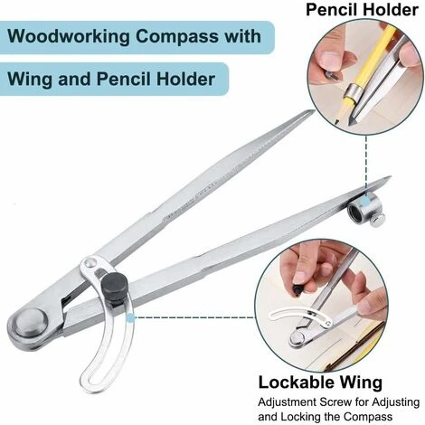 . La pointe en métal de cette compas menuisier peut être gravée et ne glissera pas, ce qui peut être utilisé pendant une longue période. C’est un bon outil pour la grande menuiserie, le marquage, le dessin, le travail du métal et du cuir. [ Compas Pointe Seche avec Aile et Porte Crayon ]: La boussole de précision avec aile verrouillable permet de répéter facilement des mesures, de dessiner des cercles, de dessiner des arcs, qui ne sautent pas ou ne glissent pas hors de votre contrôle.