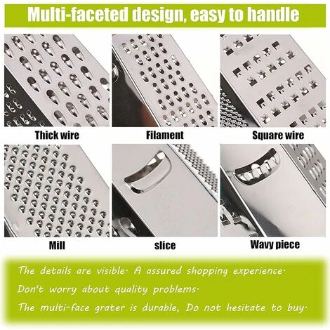 – Rape à usages multiples avec 6 fonctions de base pour le meulage quotidien, le tranchage, la coupe et la cuisson. Convient pour raper du fromage, des carottes, des légumes, du fromage, de la noix de muscade, du gingembre, de l’ail, du chocolat, de la noix de coco, etc.