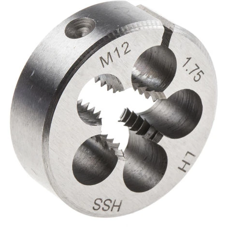 Filières métriques avec filetage à gauche. Acier haute qualité, grande vitesse Filet métrique gros Mallette de rangement en polypropylène Les tailles M3 – M6 ont un diamètre de 13/16 (20 mm) Les tailles M8 – M12 ont un diamètre de 1 5/16 (33 mm)
