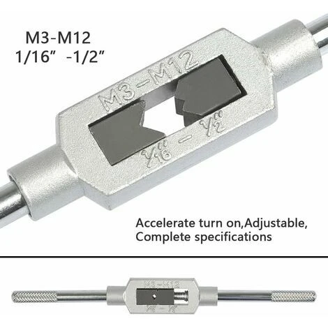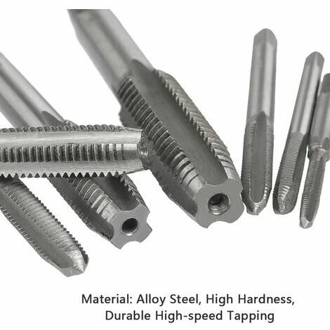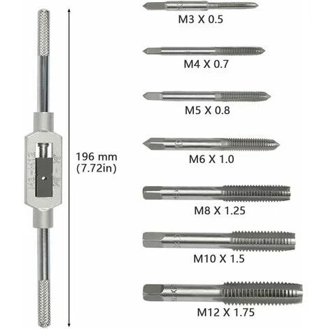 【Matériel】Ensemble de tarauds métriques 8PCS en excellent acier rapide, haute dureté avec une bonne durabilité, performant en taraudage, rapide avec une grande précision. Convient aux métaux mous, tels que les plaques d’aluminium, les plaques de fer. taraudage en acier rapide【Taille et longueur】Taille du taraud métrique : M3*0,5, M4*0,7, M5*0,8, M6*1,0, M8*1,25, M10*1,5, M12*1,75, taraud à filetage grossier standard ; Longueur du taraud métrique : 46 mm/1,81 (M3), 52 mm/2,05 (M4), 60 mm/2,36 (M5), 62 mm/2,44 (M6), 70 mm/2,76 (M8), 75 mm/2,95 ( M10), 82 mm/3,23 (M12), (env.) et la longueur de la clé à taraud droite est de 196 mm/ 7,72 pouces plastiques, enlèvement de copeaux et taraudage simultanés. L’ensemble de tarauds à vis à main pour machine a différents tarauds pointus en spirale de 7 tailles pour enfiler un tube circulaire, des rangées de broches pour répondre à vos différents besoins. sont longs pour fournir plus de levier que les clés à poignée en T, utilisées pour tenir des robinets plus grands et dans des espaces ouverts où il y a de la place pour tourner les clés à robinet 【Polyvalence et large application】 Le jeu de tarauds et matrices métriques convient à une utilisation manuelle et à la machine, idéal pour la réparation automobile, les projets ménagers et les machines où les filetages métriques sont spécifiés
