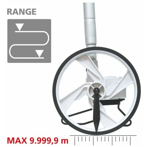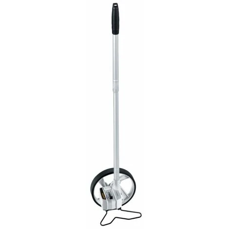 Le télémètre à roue sutilise avec grande fiabilité sur des droites et des courbes. La roue, qui mesure au centimètre près, détermine des distances jusquà 9 999,9 mètres et affiche les mesures prises sur un écran facile à lire. Le format compact permet la prise directe de mesures de mur à mur. Une aiguille mobile indique avec précision les positions initiale et finale. Chaque avancée entraîne une addition, chaque recul une soustraction. Le manche télescopique et la béquille escamotable le rendent facile à transporter.