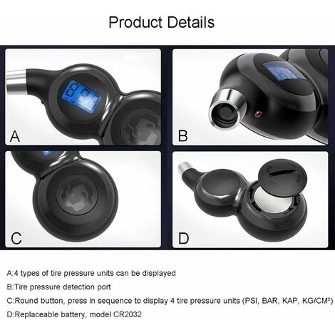 Jauge de pression de pneu de haute qualité: 4 unités de PSI, bar, kpa, kg / cm² peut être affichée en séquence avec un seul bouton, qui peut être utilisé pour vérifier la pression des pneus des vélos, des motos, des voitures, des camions et d’autres véhicules