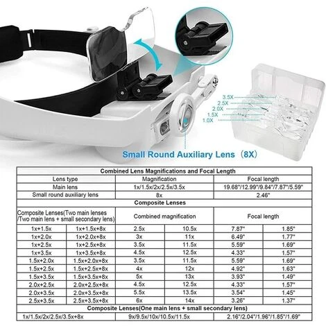 Conception à double fente de lentille: la conception de la loupe sans main a deux fentes de lentille et une petite lentille ronde avant fixe (8X). Vous pouvez placer une ou deux lentilles à la fois sur la fente. Nous vous proposons cinq lentilles remplaçables (1.0x, 1.5x, 2.0x, 2.5x, 3.5x) et de petites lentilles auxiliaires circulaires (8X). Note: Veuillez vous référer à notre troisième image publicitaire et ajuster la lentille et la focale pour compléter l’agrandissement