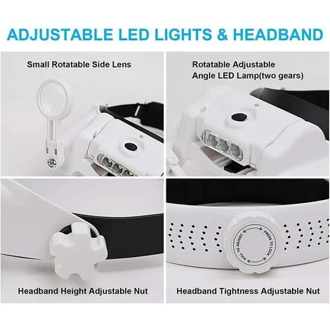 Expandeur confortable et réglable du bandeau: l’intérieur du bandeau est enveloppé d’éponge molle pour un ajustement plus confortable de la tête. Loupe à lentilles combinées avec 3 boutons. Vous pouvez utiliser 2 boutons sur le côté pour régler la hauteur / l’angle de la lentille et un autre bouton sur le dos pour ajuster la taille de la tête. Les lentilles combinées peuvent être inclinées ou pliées. La petite lentille circulaire peut être tournée à 360° et peut être pliée ou tournée vers le Haut sans besoin.