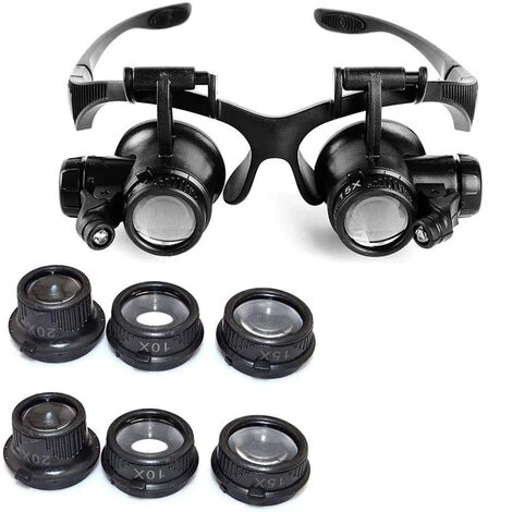 Caractéristiques : loupe gauche et droite double face avec LED réglable, 4 paires de lentilles remplaçables avec différents grossissements. Source de lumière LED et compartiment de batterie sont conçus séparément. Les lunettes mains libres et les lunettes et le bandeau sont interchangeables pour garantir plus de confort et une utilisation plus large. Les patchs peuvent être déplacés et pivotés à 180 degrés vers le haut et vers le bas. Utilisé dans le traitement mécanique, la réparation électronique, l’évaluation des bijoux, la réparation et la gravure miniature, etc. Spécifications : grossissement : 10 x, 15 x, 20 x, 25 Couleur : noir. Matériau : ABS + lentille optique. Dimensions du paquet : 14,7 x 12,2 x 6,1 mm. Poids du paquet : 163 g.