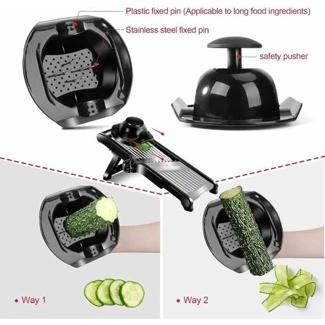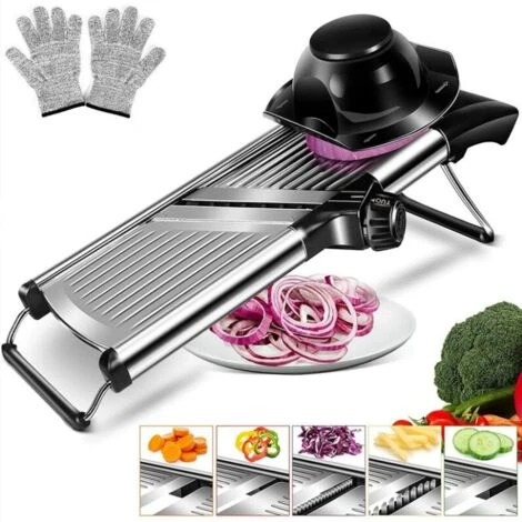 est ergonomique et offre une prise en main confortable. - Pas Besoin de Toucher les Lames : Notre colis est livré avec des gants de sécurité résistants aux coupures. Une lame pour le rangement. Un support pour trancher les aliments. Une brosse spécialement conçue pour le nettoyage. Ne vous inquiétez pas