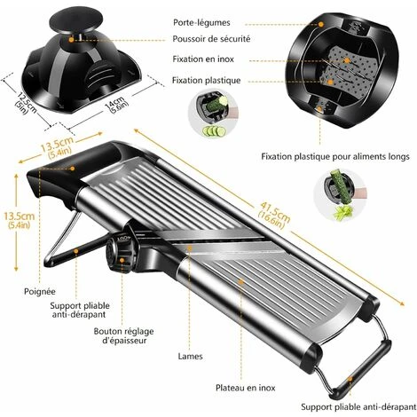 de terre ou des frites rapidement et en toute sécurité. L’unité se replie à plat pour un rangement facile dans un tiroir. - Qualité Supérieure : Notre mandoline professionnelle est fabriquée en acier inoxydable de qualité alimentaire et très durable. Il donne au hachoir une construction robuste qui l’empêchera de se plier ou de se déformer avec facilité.