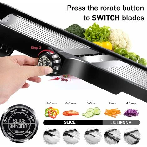 couper comme vous le voyez pour s’adapter à tout type de légumes, fruits ou frites. Aussi, avec notre trancheuse, vous pouvez régler l’épaisseur de très fine à 9 mm pour une salade parfaite. - Utilisation Polyvalente : Cette trancheuse à légumes peut trancher de très fine à 9 mm d’épaisseur. Deux réglages Julienne : 4,5 mm et 9 mm. Notre emporte-pièce permet de préparer des repas rapides et sains à base de légumes, des frites de pommes