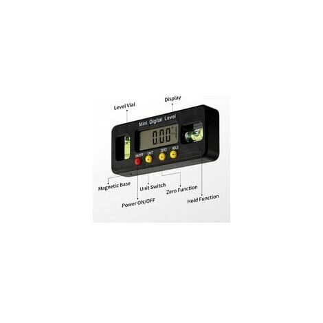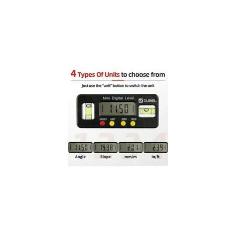 [Haute précision] Quatre unités de mesure différentes offrent un large éventail d’applications pour répondre à différents besoins. [Veille automatique] Cet inclinomètre numérique s’éteint automatiquement au bout de 5 minutes pour protéger la batterie. [Base magnétique] Ce mini niveau électronique est doté d’une base magnétique puissante qui permet de le fixer facilement et fermement à l’objet à mesurer. [Fonction puissante] Cliquez sur le bouton « Retour au zéro » pour régler l’angle relatif du zéro, puis cliquez sur le bouton « Maintien » pour maintenir la lecture actuelle à l’écran. [Rappel] Lorsque le plan de mesure n’est pas plat ou qu’il existe un écart important entre le plan de mesure et le fond du produit, le retour à zéro est entaché d’une erreur. (Ce produit est vendu sans piles)Ce produit est un outil de mesure d’angle et de niveau nouveau et innovant, doté d’un écran LCD pour une lecture facile. Léger et facile à transporter et à utiliser. Particulièrement pratique pour mesurer divers angles, les angles horizontaux et les angles de biseau des scies à onglets, les contrôles de volume des véhicules et les réparations.