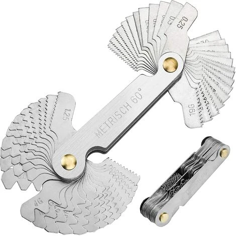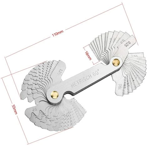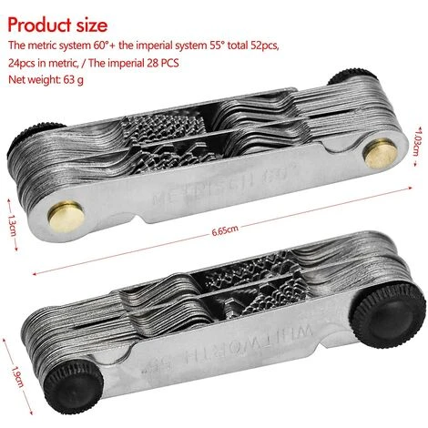 [TAILLE] : système métrique (mm) 60°+Whitworth-55°, jauge de filetage[Quantité]: Jauge de pas de filetage métrique (mm) 60°, 24 pcs. Whitworth-55°, 28 gags au centre de la lame.[Mesure précise] : le bord en dents de scie est clairement marqué. Les chiffres sont précis et faciles à lire.[Utilisation] : Il est généralement utilisé pour vérifier la taille et le pas corrects des filetages internes et externes de la vis, et pour meuler et positionner le coupe-fil sur le tour.[Facile à utiliser] : il y a une conception de trou aux deux extrémités de la jauge de fil, qui peut être ajustée librement à partir de la position où vous appuyez sur la jauge de dent, et la lame de fil peut être facilement tournée.