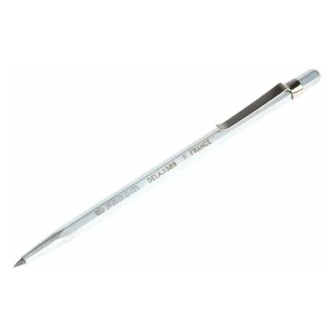 Pointe à tracer type crayon. Pointe à tracer de type crayon, à corps hexagonal en acier, muni d’une agrafe. La pointe d’une longueur de 12 mm est réaffûtable.
