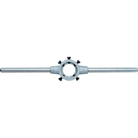 Porte-filière avec vis de serrage, Pour Ø filière x hauteur : 45 x 18 mm, Métrique M16-20 mm, métrique fin -, Tubulaire Whitworth : -, Whitworth : 5/8-3/4, UNC 5/8-3/4, UNF -, Longueur 450 mm – Boîter en zinc fin avec moulage sous pression ZL 0410 – EN 22568 – Poignées en acier dévissables – Avec vis de serrage 4/5 Remarque : pour le logement direct de filières fermées et fendues selon EN 22 568 et EN 24 801.