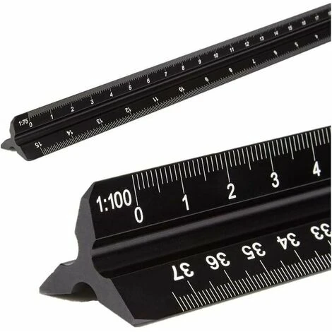 La règle mesure 30,5 cm de longueur environ et dispose de 3 côtés concaves avec 6 des échelles les plus couramment utilisées : 1:20, 1:25, 1:50, 1:75, 1:100, 1:125.