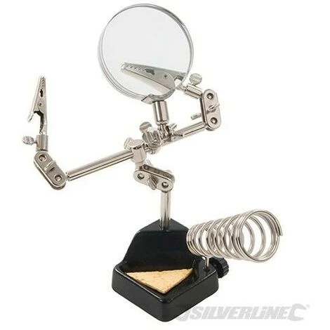 Outil polyvalent permettant de tenir des objets lors d’opérations de soudage ou autres travaux demandant une grande précision. Permet d’avoir les mains libres. Loupe de 60 mm de diamètre. Socle en fonte ultra-résistant avec bras réglable. Comprend 2 pinces crocodiles, un support pour fer à souder et une éponge. Idéale pour des tâches minutieuses comme en électronique, artisanat ou modélisme.