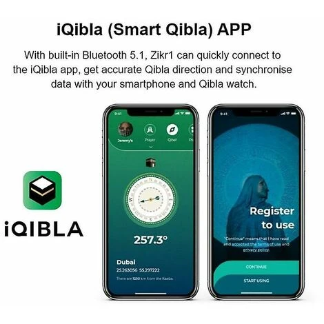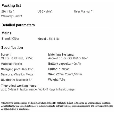 Batterie longue durée Le Zikr1 lite est équipé d’une batterie haute capacité pour 3 jours d’utilisation normale. Il peut être chargé n’importe où et n’importe quand par un câble USB vers un adaptateur, une banque d’alimentation ou un ordinateur ; 5 couleurs, seulement 7,7 gZikr1 lite est disponible en 5 couleurs et ne pèse que 7,7 g, ce qui le rend confortable à porter, élégant et jeune. Ce serait un excellent cadeau pour votre ami musulman. Application iQibla (Smart Qibla) Avec Bluetooth 5.1 intégré, Zikr1 lite peut se connecter rapidement à l’application iQibla, obtenir des directions Qibla précises et synchroniser les données avec votre smartphone et votre montre Qibla.