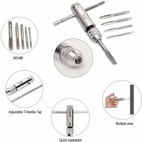 Fini chromé pour une durabilité maximale. Taille des tarauds: M3-0,5, M4-0,7, M5-0,8, M6-1,0, M8-1,25. Utilisation: Pour les robinets M3-M8.La tête est entièrement réglable pour s’adapter à toutes les tarauds de taille métrique et l’outil est entièrement réversible via le commutateur à cliquet. La poignée est réglable et amovible, idéale pour éviter les obstacles à proximité et faciliter le filetage dans les zones peu pratiques.Clés à tarauds à cliquet et à poignée en T Boîtier d’engrenage à trois positions pour une action de cliquet rapide et efficace, une poignée coulissante avec taraud à ressort, peut être étendue dans les deux sens pour plus de force.Clé à taraud métrique M3-M8 (corps long de 86 mm x largeur de poignée de 100 mm) pour passer facilement de la main gauche à la main droite ou verrouillée pour une utilisation sans cliquetConçu pour une utilisation avec des tarauds et peut également être utilisé sur le taraud gauche, des alésoirs, des extracteurs de vis et autres outils à queue carrée.